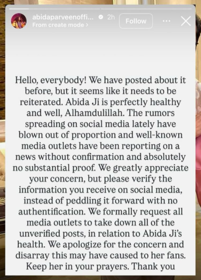 “Hello, everybody! We have posted about it before, but it seems like it needs to be reiterated. Abida Ji is perfectly healthy and well, Alhamdulillah,” the statement read.