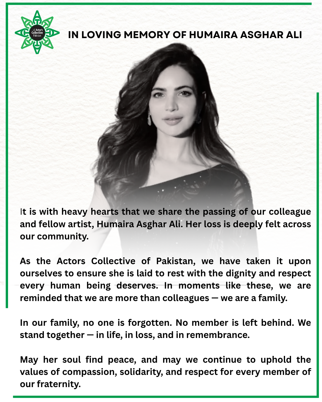 In a heartbreaking update to the tragic death of Pakistani actress Humaira Asghar, the Actors Collective of Pakistan has come forward to take responsibility for her burial. The actress was found dead in her DHA Phase VI apartment in Karachi. Despite the sorrowful discovery, what shocked many even more was the refusal of her family to claim her remains.