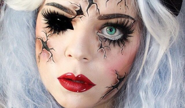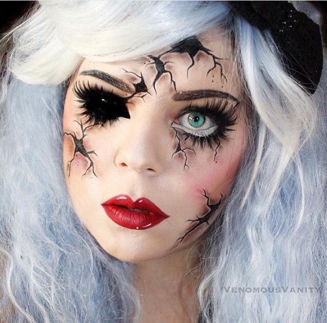 - Cracks: Use a black liner. Draw fine lines around your mouth and eyes. This creates a porcelain crack effect.