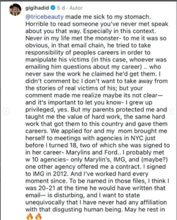 Responding to a social media comment, Hadid described the documents as “disturbing” and “sickening.” She emphasized that she had never met or had any affiliation with Epstein.