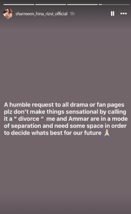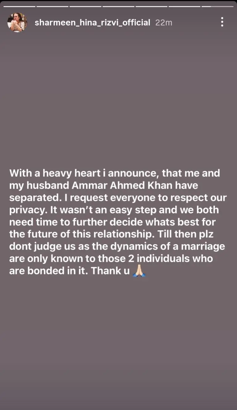 In a heartfelt statement shared online, Hina said, “With a heavy heart, I announce our separation. Please respect our need for privacy and space. No one truly understands the dynamics of a marriage except the people in it.”