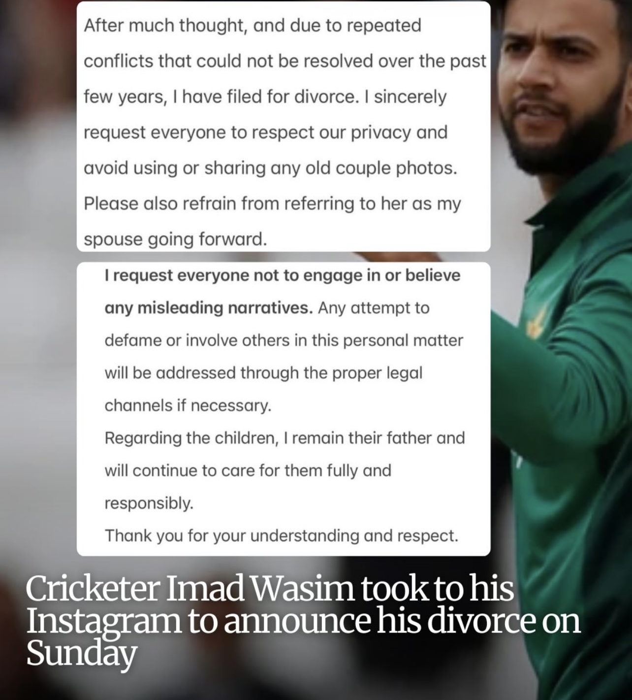 Imad Wasim made a personal post. He announced the end of his marriage. The all-rounder used his official Instagram handle @imadwasim. He did not share detailed reasons initially. The post informed fans and the public directly.