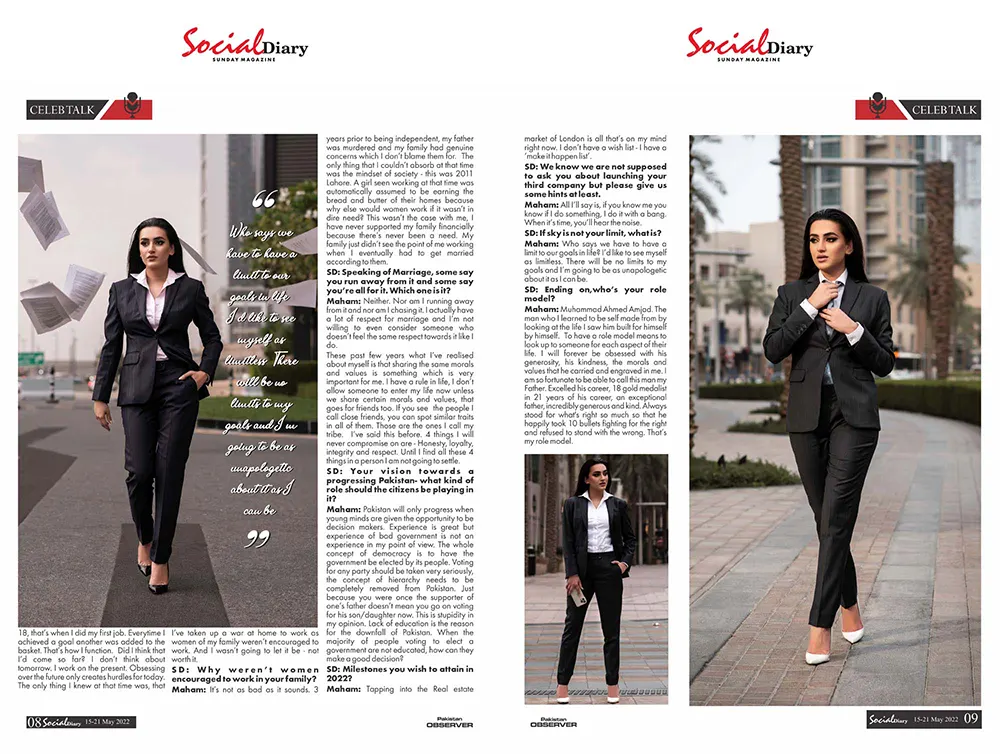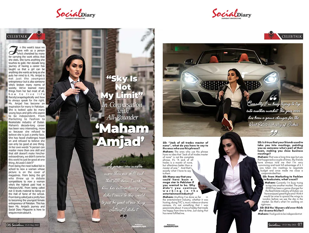 In this week’s issue we have with us a person who’s cherished by many for carrying the work ethics that she does. She turns anything she touches to gold. Her decade long journey of having a career has taught us that a girl can be anything she wants as long as she puts her mind to it. Ms. Amjad is not just the youngest entrepreneur but is also someone who’s broken many norms of society. We’ve learned many things from her but most of all, how to live life fiercely/unapologetically and how to always speak for the right. Ms. Amjad has become an inspiration for many in Pakistan. She is looked upto by many young boys and girls who aspire to be independent. From Marketing to Fashion to Realestate industry of Dubai. Maham’s decade-long career has been very interesting, more so because she refused to believe she is just a pretty face. She has faced challenges head on and refused to believe she can only be good at one thing. In her own words “A person can master more than one skill and that still doesn’t make him/her extraordinary, we didn’t come to this world to just be good at one thing. At Least I didn’t”