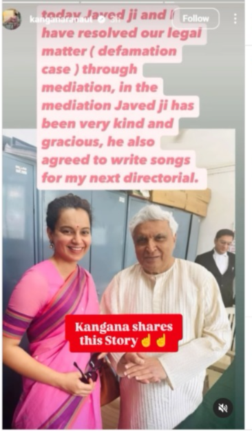 Kangana Ranaut shared the news of the settlement with her followers on Instagram. She wrote, “Today, Javed Ji and I have resolved our legal matter (defamation case) through mediation. In the mediation, Javed Ji was very kind and gracious. He has also agreed to write songs for my next directorial.”
