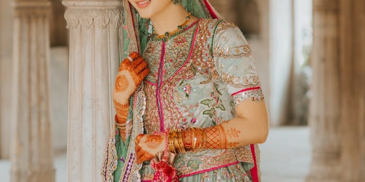 Mawra’s nikkah look was a carefully crafted design by Rano’s Heirlooms. The outfit featured a pale blue lehenga with golden floral motifs and delicate pink and purple embroidery. The thick border of shocking pink, deep purple, and icy blue added a regal touch. Paired with a koti-style short shirt, the outfit was made even more striking with bright pink and green piping. A green scalloped-edged dupatta, slightly brighter than the lehenga, completed the look beautifully.