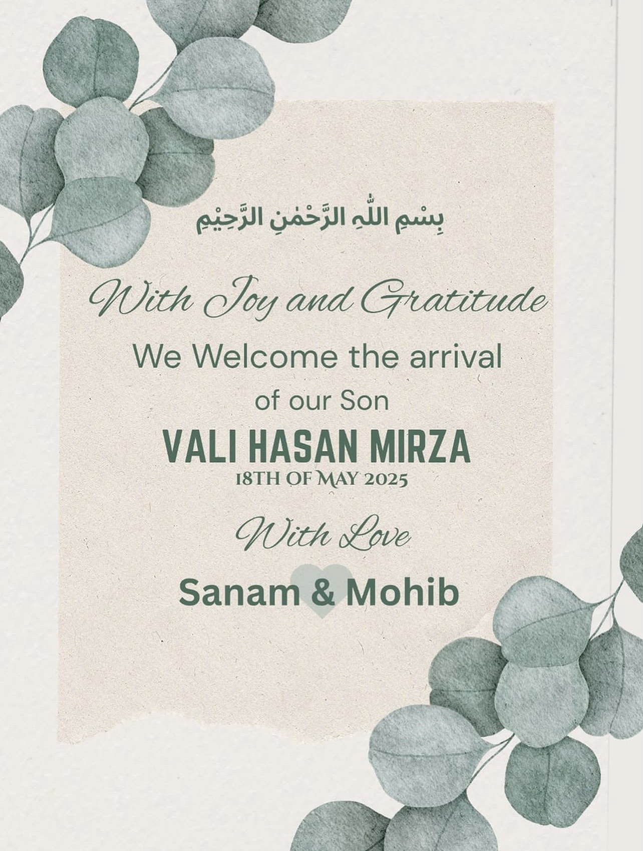 “Our hearts are full. With love, wonder, and the tiniest little fingers – we welcome our son Vali Hasan Mirza into the world. Surrounded by love. All that is by the will of Allah – there is no power except through Him. Please keep our little one in your duas.”