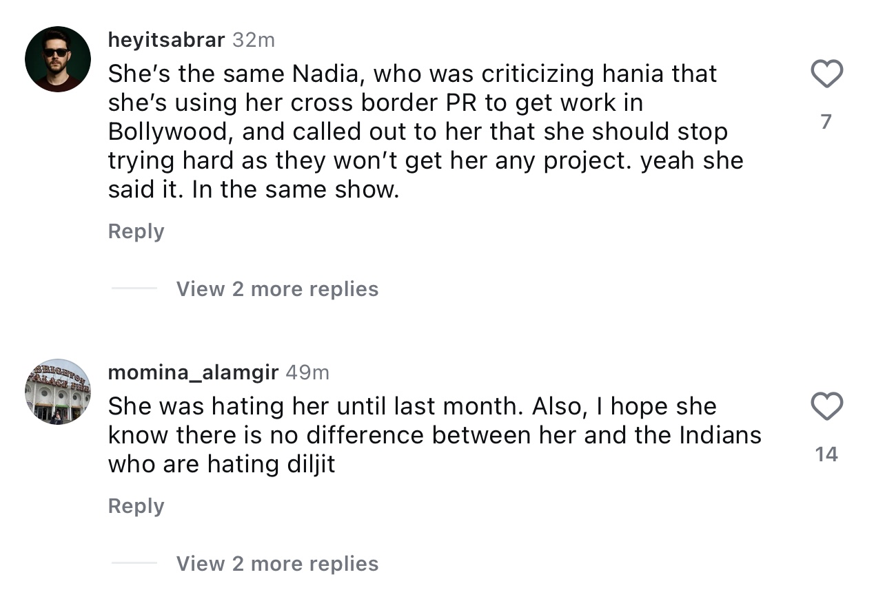 Pakistani TV host Nadia Khan is facing criticism for her contradictory statements on Hania Aamir and Diljit Dosanjh’s movie Sardaarji 3.