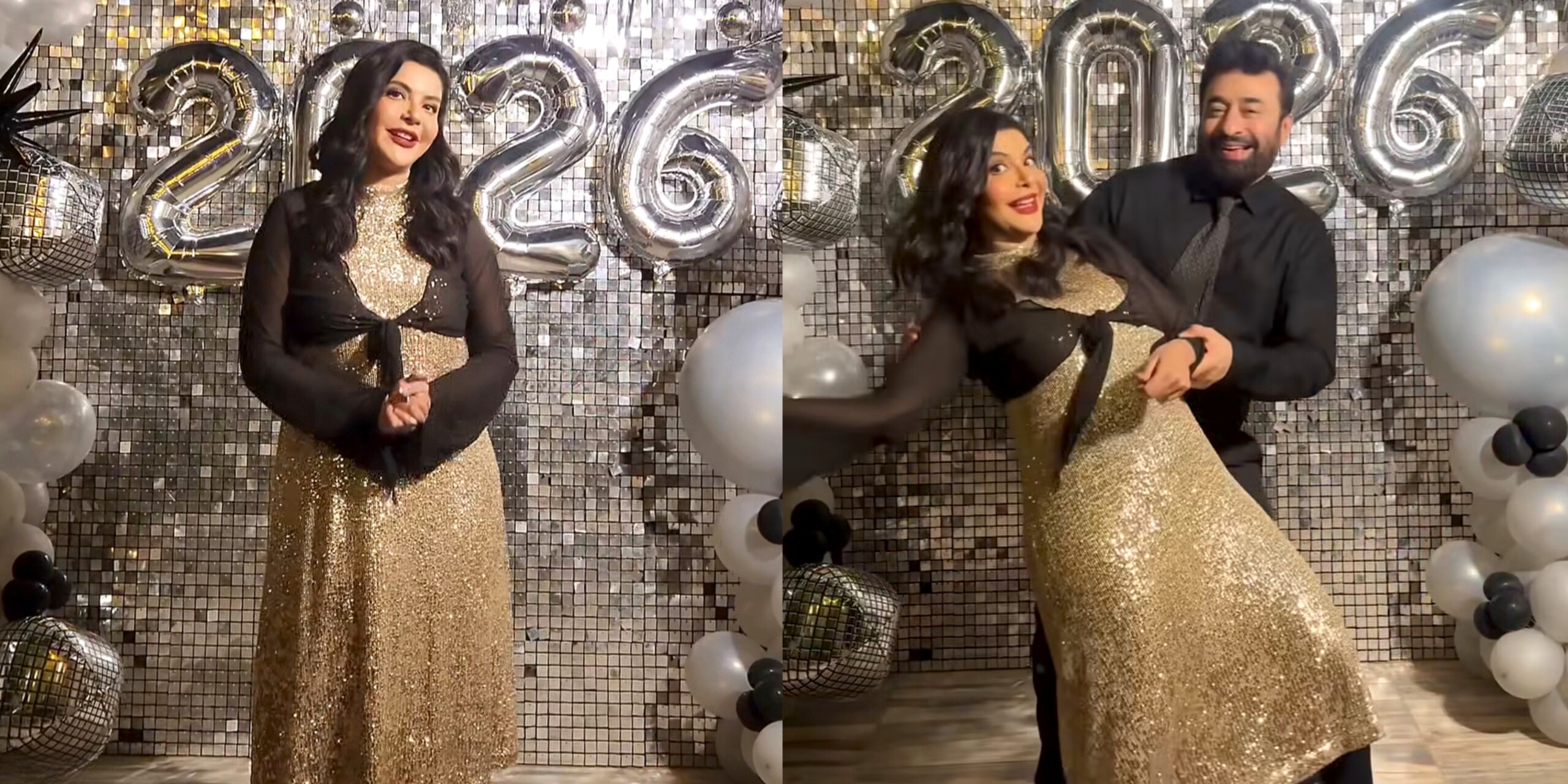 For the New Year celebration, Nida Yasir wore a gold sequin midi dress paired with black leggings and a short black shrug knotted at the front. The family coordinated in black and gold outfits, posing together for celebratory photos that soon caught public attention.