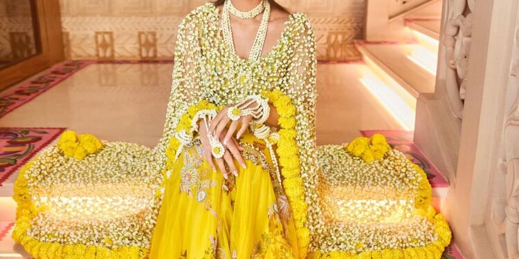 The highlight of her yellow ensemble created by Anamika Khanna was her “phoolon ki chadar dupatta.” The dupatta was adorned with mogra flower buds while the border featured yellow marigold flowers.