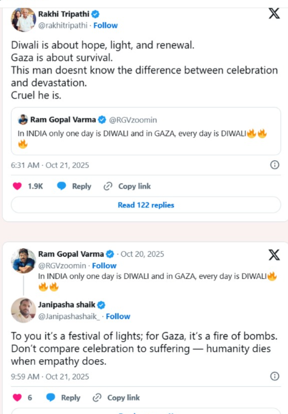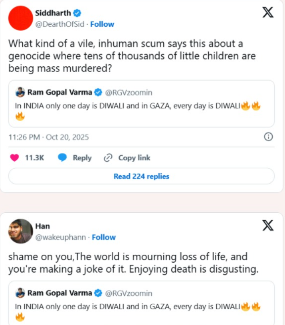 Outraged netizens from India and Pakistan alike condemned Varma for mocking the humanitarian crisis in Gaza. Critics argued that Diwali, a celebration rooted in peace and good triumphing over evil, should never be compared to ethnic cleansing and mass civilian deaths.