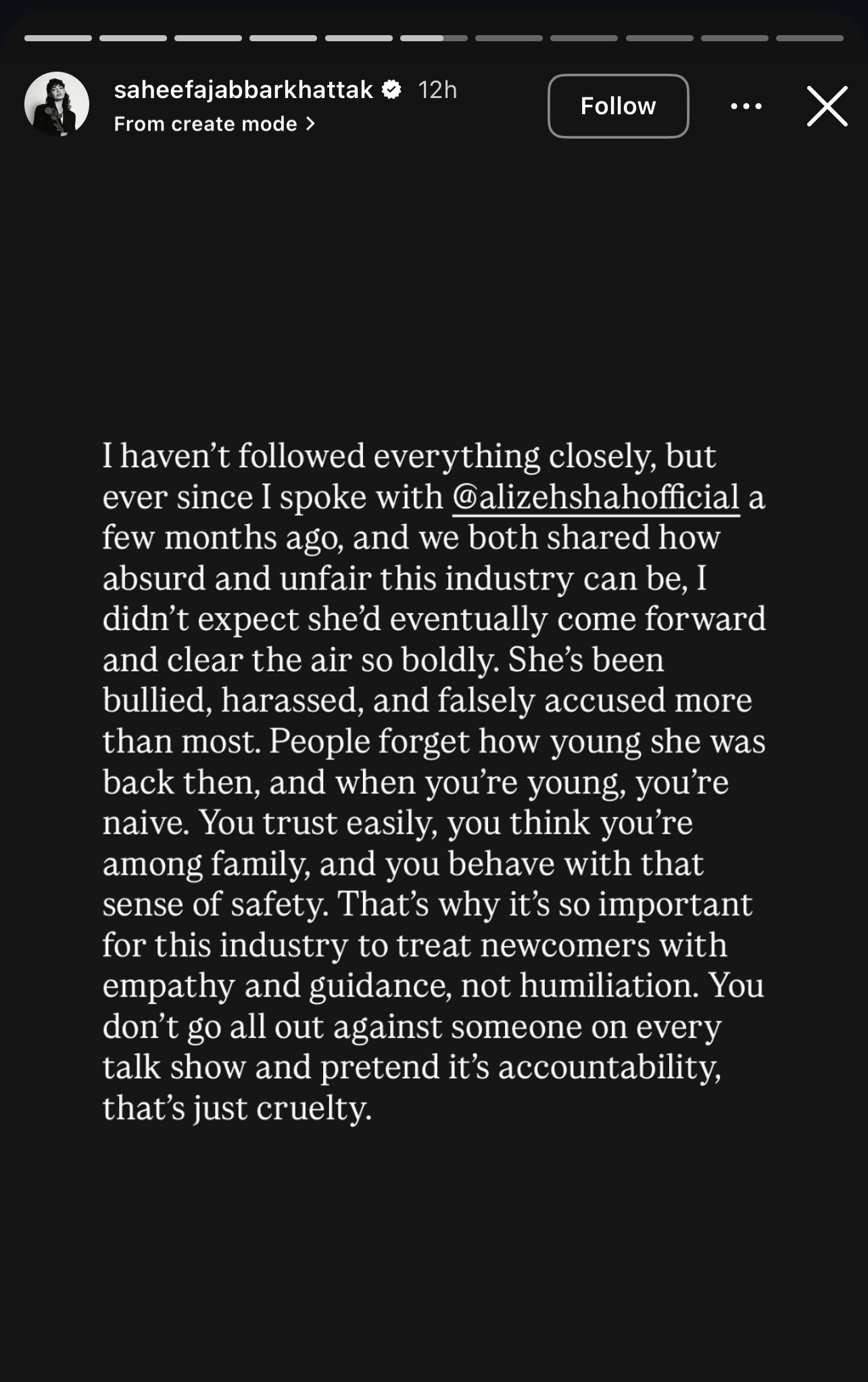 Saheefa urged former actors to support newcomers. She believes the industry needs mentorship, not hostility. Saheefa Jabbar Khattak’s statements highlight deep-rooted issues in the drama industry. Her support for Alizeh Shah and Juggan Kazim’s accountability sets a positive example.