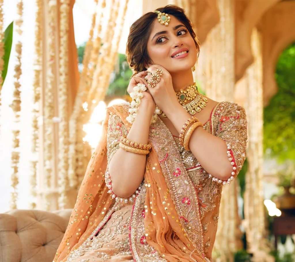 The wedding look is overhauled with clarification jewels, including a profound choker, matching bands, and a rich maang tikka. The beauty care products, kept fragile and sparkling, feature Sajal’s customary gloriousness, enhancing the pastel tones of the outfit. Her hairstyle a smooth, low bun decorated with ordinary additional items adds to the famous energy of the shoot.