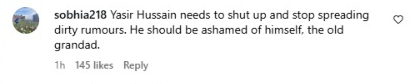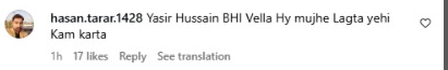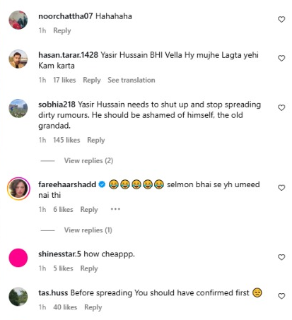 Yasir, known for his unfiltered opinions, shared a snide comment regarding the Salman Khan and Shera wedding rumor, which did not sit well with many online users. His reaction was perceived as mockery, leading fans to call him out. One angry fan commented, “Yasir Hussain, koi achi baat kar liya karo,” while another labeled him the “old granddad of Instagram.”